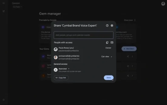 Com este lançamento, você pode compartilhar Gems com outros usuários em sua organização e fora dela. Gems são versões personalizáveis do Gemini que você pode personalizar para se tornar especialista em qualquer tópico. Uma vez compartilhadas, outros usuários podem editar, usar ou fazer uma cópia da Gem. O compartilhamento de Gems é alimentado pela mesma tecnologia do Google Drive, então você notará uma interface e uma experiência familiares e consistentes, como se estivesse compartilhando outros arquivos, como um Documento Google.