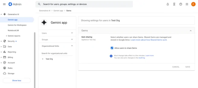 Os administradores podem controlar se seus usuários podem compartilhar Gems usando uma nova configuração do Console de Administração localizada em Generative AI > Aplicativo Gemini > Gems.