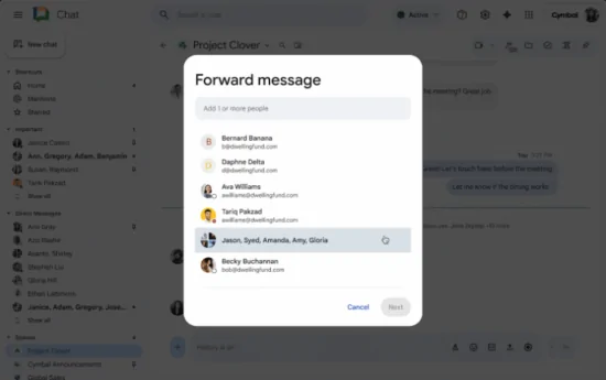 Para facilitar o compartilhamento de informações entre diferentes conversas, estamos introduzindo a possibilidade de encaminhar mensagens no Google Chat. Esse novo recurso elimina a necessidade de soluções alternativas manuais, como copiar e colar texto ou compartilhar capturas de tela.