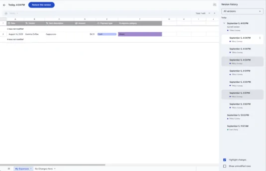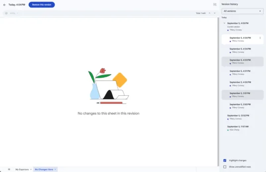 Estamos introduzindo uma nova visualização condensada para o histórico de versões no Planilhas Google. Por padrão, o Planilhas agora mostrará apenas linhas com células que tiveram alterações na versão selecionada. O histórico de versões condensado ajudará os usuários a identificar edições relevantes na planilha com mais rapidez e eficiência.