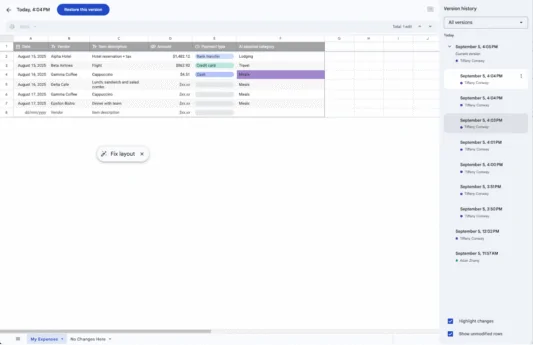 O histórico de versões é uma ferramenta que pode ajudar os usuários a recuperar informações, entender alterações ou ver quem fez uma edição específica em uma planilha. Para retornar à experiência anterior do histórico de versões, em que a planilha inteira é exibida e as células com alterações são destacadas, basta marcar a caixa de seleção “Mostrar linhas não modificadas”. Observação: alguns objetos incorporados, como imagens, podem não ser exibidos quando a visualização condensada estiver ativada.