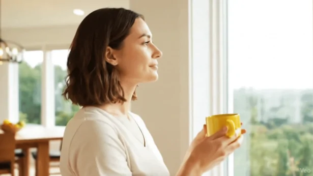 Generate a video of a woman holding a mug, then cut to the company branded packaging using the provide images
