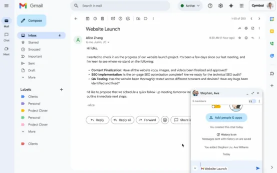 Estamos lançando uma nova integração entre o Gmail e o Google Chat, projetada para melhorar a colaboração e a produtividade da equipe. Com esse recurso, você pode compartilhar facilmente uma conversa da sua caixa de entrada do Gmail para uma mensagem direta ou espaço do Chat. Não é mais necessário começar a conversa com “Você viu o e-mail que encaminhei?” ou vasculhar sua caixa de entrada para encontrar a mensagem em discussão.