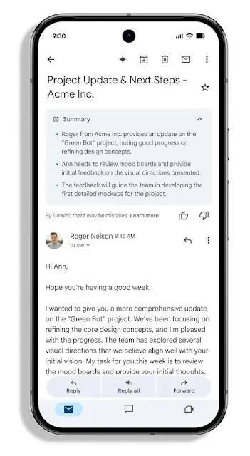 A partir de hoje, os resumos estarão disponíveis no topo do conteúdo do e-mail para mensagens em que um resumo seja útil, como sequências de e-mail mais longas ou mensagens com várias respostas. O Gemini sintetizará todos os pontos principais da sequência de e-mails e quaisquer respostas posteriores também farão parte da sinopse, mantendo todos os resumos atualizados.