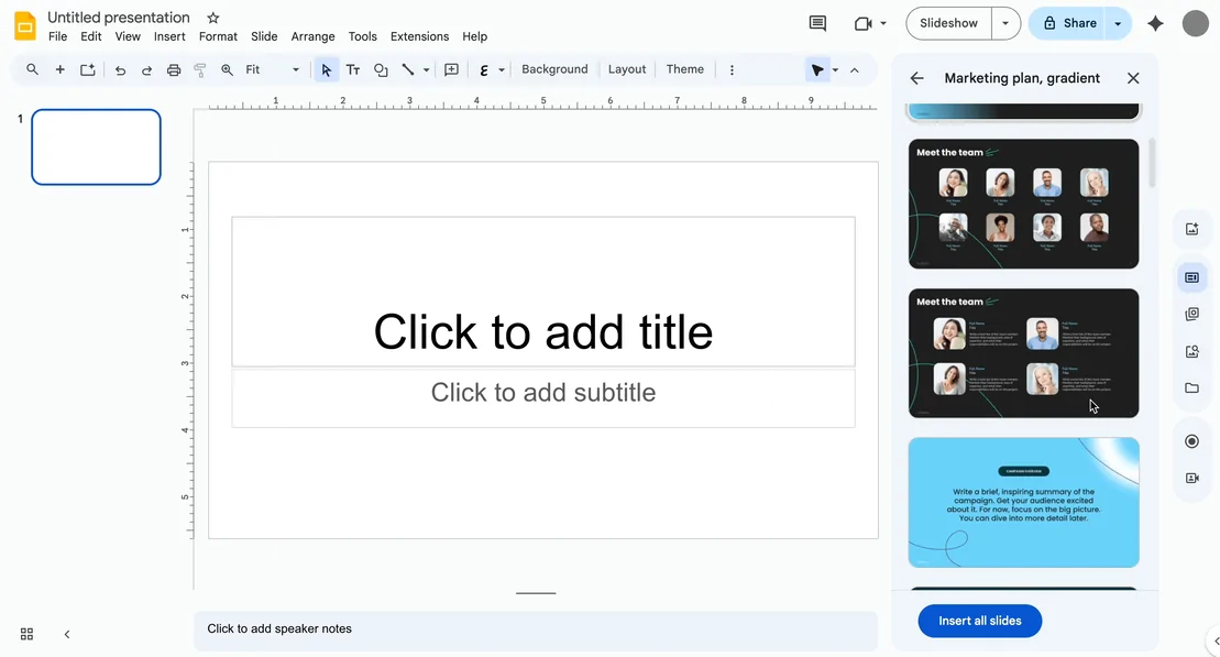 - Você pode acessar os modelos pela nova barra lateral ou acessando Inserir > Modelos. Após clicar, você pode navegar pela coleção, selecionar um modelo que combine com sua visão e estilo e optar por inserir todos os slides ou apenas os que você precisa antes de personalizar o modelo com seu próprio conteúdo.