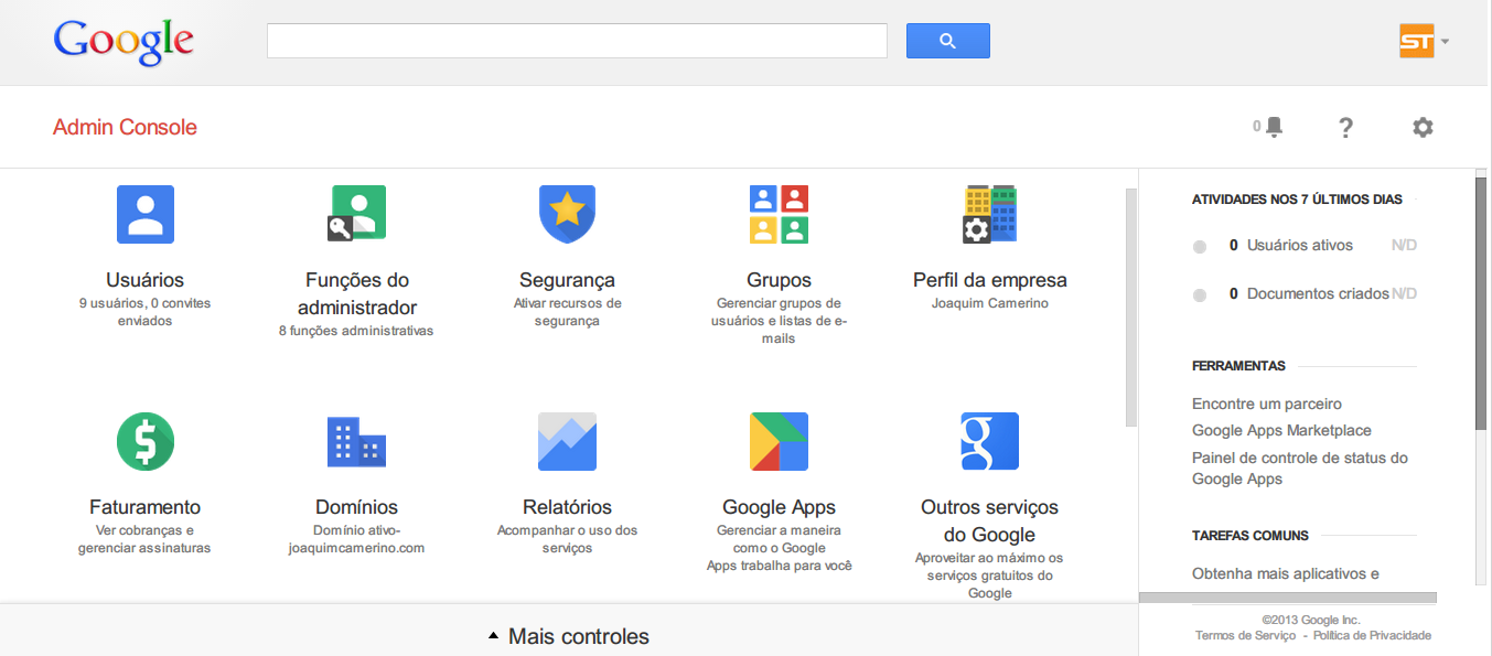 No Painel de Controle os administradores podem gerenciar as contas de usuários, definir politicas e regras e controlar os serviços G Suite dentro da empresa, uma ferramenta completa para administrar o domínio.