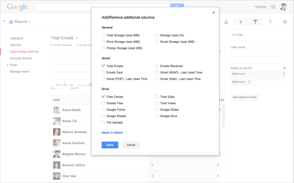 Essa página mostra dados sobre como os usuários individuais estão trabalhando com o Gmail, Drive, armazenamento e outros aplicativos. Escolha as informações que deseja ver e mova as colunas para personalizar o seu ponto de vista.