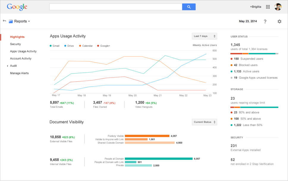 O destaque da página do painel de controle Google apps, localizada na seção de relatórios, lhe da uma visão geral de toda a atividade em todo o seu domínio. Você pode ver quantos Hangouts, Docs e Slides sua organização criou, quem está perto de atingir sua cota de armazenamento do Gmail e ou Drive e e quantos arquivos foram compartilhados fora da empresa.
